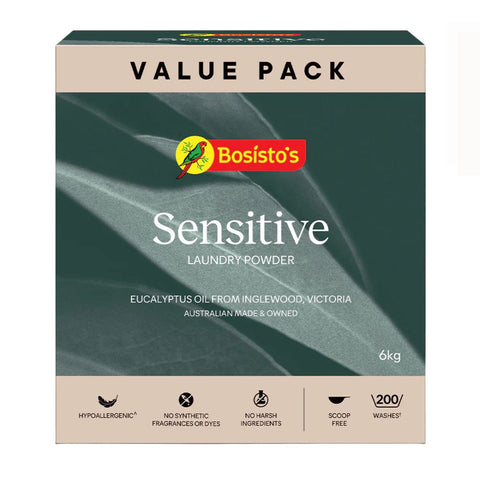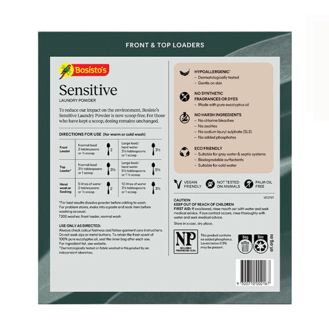 To reduce our impact on the environment, Bosisto’s Sensitive Laundry Powder is now scoop-free. For those who have kept a scoop, dosing remains unchanged.