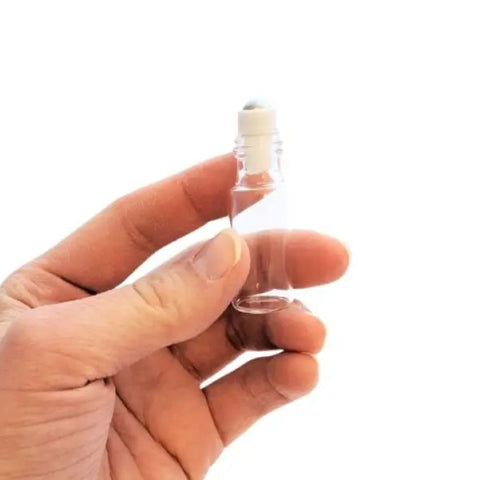 4ml Clear Glass Bottle with Stainless Steel roller top and black lid.