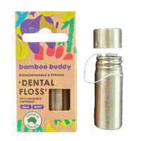 Contents: 1 x Bamboo Buddy Natural Silk Mint Dental Floss, 30m length with stainless steel reusable dispenser.