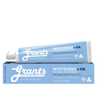 Grants Whitening +HA is the ultimate toothpaste for brighter, stronger, and healthier teeth. Powered by Hydroxyapatite (HA), which has been shown to naturally whiten, strengthen and remineralise your teeth, helping to restore their natural shine. Baking Soda gently removes stains while Coconut Oil works to naturally fight bacteria and promotes oral health. The minty flavour keeps your mouth feeling fresh and clean all day long. Grants Whitening +HA has everything you need for a brighter, healthier smile.