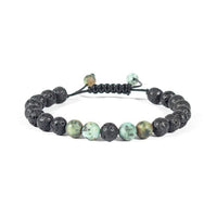 This handmade bracelet features African Turquoise and lava stones. African Turquoise is an excellent stone for personal growth and development. It encourages metamorphosis as well as the acquiring of great wisdom and knowledge. Lava Beads are made from Natural Volcanic Basalt. The lava stones acts as a sponge-like carrier as it soaks up your oils and retains them in the core of the Bead.