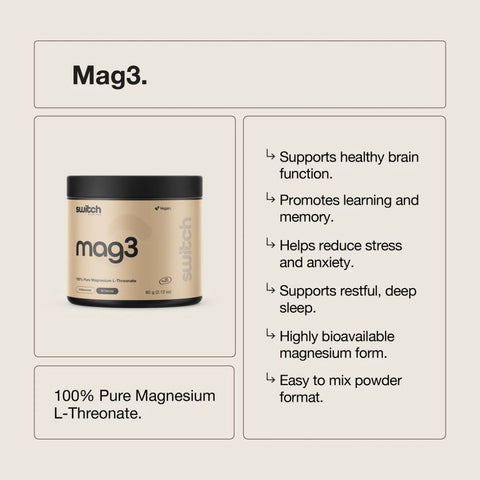 MAG3 features Magnesium L-Threonate, the only form of magnesium clinically shown to cross the blood–brain barrier. Unlike standard magnesium forms that mainly support muscles and digestion, MAG3 is designed to target the brain and nervous system, supporting focus, calm, memory, and high-stress recovery.