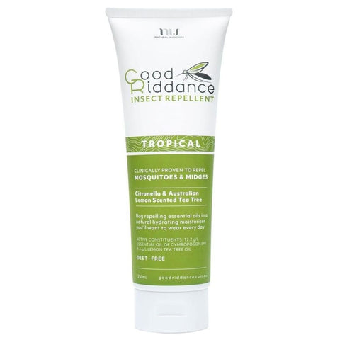 Purified Water, Sunflower Oil, Organic Shea Butter, Organc Cocoa Butter, Jojoba Oil, Beeswax, Natural Olive Emulsifying Wax, Stearic Acid, Cetyl Alcohol, Organic Vegetable Glycerin, Sclerotium Gum, Sodium Benzoate, Potassium Sorbate, Natural Tocopherol, Citric Acid, Sodium Phytate, Vanillin, Good Riddance Tropical proprietary Blend.