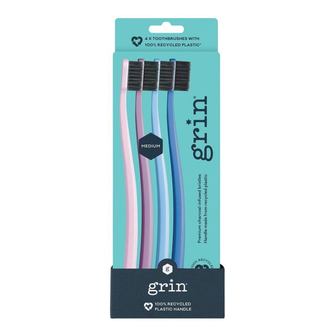 This beautifully designed, Medium toothbrush by Grin uses recycled material and is designed to have minimal impact on the environment. With soft micro slim-tip bristles infused with premium activated charcoal, this natural toothbrush reaches deep between teeth and along the gumline for a superior clean!