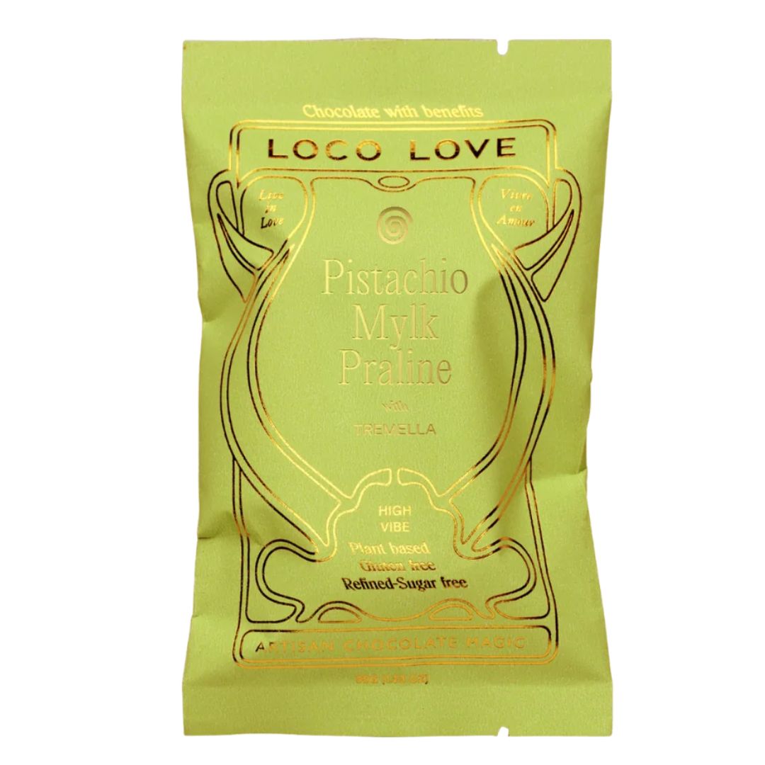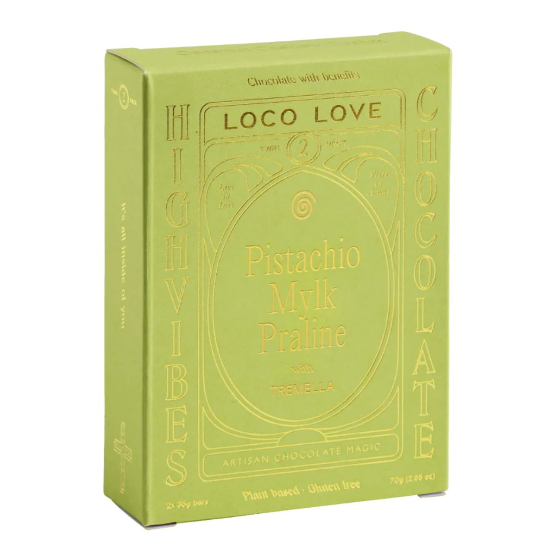 pistachio (48%), *cacao butter, *coconut milk powder, inulin, maple sugar, *coconut blossom sugar, *cacao paste, prebiotic tapioca fibre (IMO), *tigernut flour, wild crafted tremella mushroom powder (Tremella fuciformis) (1%), salt, *vanilla bean powder, natural flavour (MCT based). [Cacao solids 26%]. *Organic. Contains: pistachio. May be present: milk, sesame, peanut, almond, hazelnut, macadamia, cashew, pecan.