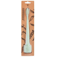 NFco Bio Brush & Stand in Rivermint comprises an attractive, ivory-coloured toothbrush with soft, BPA-free, tapered nylon bristles that are recyclable, and a non-GMO cornstarch handle, which is biodegradable when composted. The brush comes with a convenient, matching, resin toothbrush stand. The "plastic" wrapping is also made from cornstarch and is completely biodegradable.